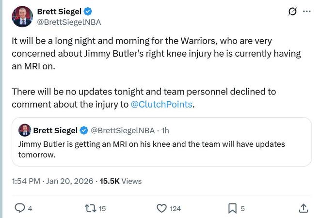 名记Brett Siegel赛后曝出,勇士非常担心巴特勒的状况,后者正在接受核磁共振检查,今天不会更新任何伤情状况,勇士队内也拒绝对伤情发表任何评论。