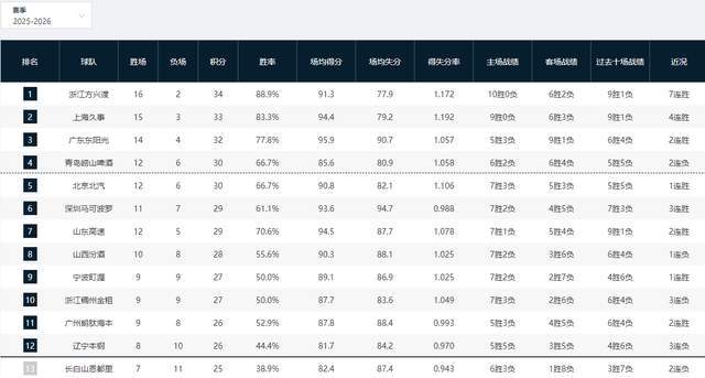 CBA常规赛第十八轮的比赛已经全部打完,经过这轮精彩的角逐,积分榜排名又发生了全新的变化。宁波击败青岛升至第九,上海大胜福建杀回第二,广州力克同曦排名第十一,山东力克辽宁暂列第七,浙江广厦和广东男篮都分别大胜对手暂列联赛第一、联赛第三,北京首钢力克浙江男篮暂列第五,新疆大胜四川排名第十四,深圳击败山西稳居第六。在每轮常规赛打完之后,积分榜排名都会被重新打乱,但是排名前三的广厦、上海、广东一直表现较为稳定,大概率最终能够拿到四强席位。
