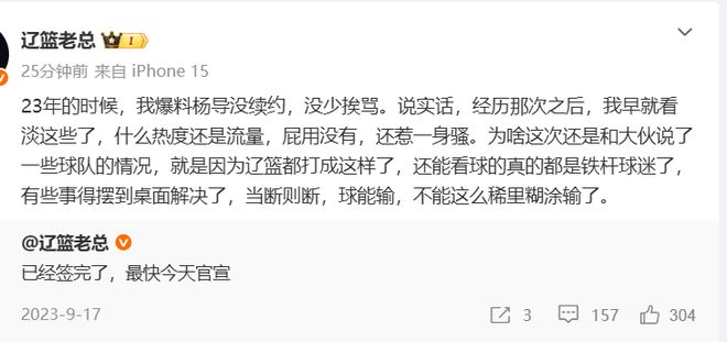 这个消息应该是比较真实的,“辽篮老总”随后继续补充:23年的时候,我爆料杨导没续约,没少挨骂。说实话,经历那次之后,我早就看淡这些了,什么热度还是流量,屁用没有,还惹一身骚。为啥这次还是和大伙说了一些球队的情况,就是因为辽篮都打成这样了,还能看球的真的都是铁杆球迷了,有些事得摆到桌面解决了,当断则断,球能输,不能这么稀里糊涂输了