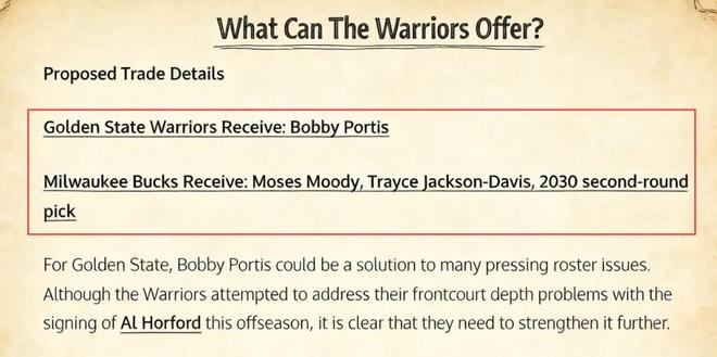 美媒《Fadeaway World》提出了一套交易方案,建议勇士将穆迪、戴维斯以及2030年的次轮签送到雄鹿,换回波蒂斯。
