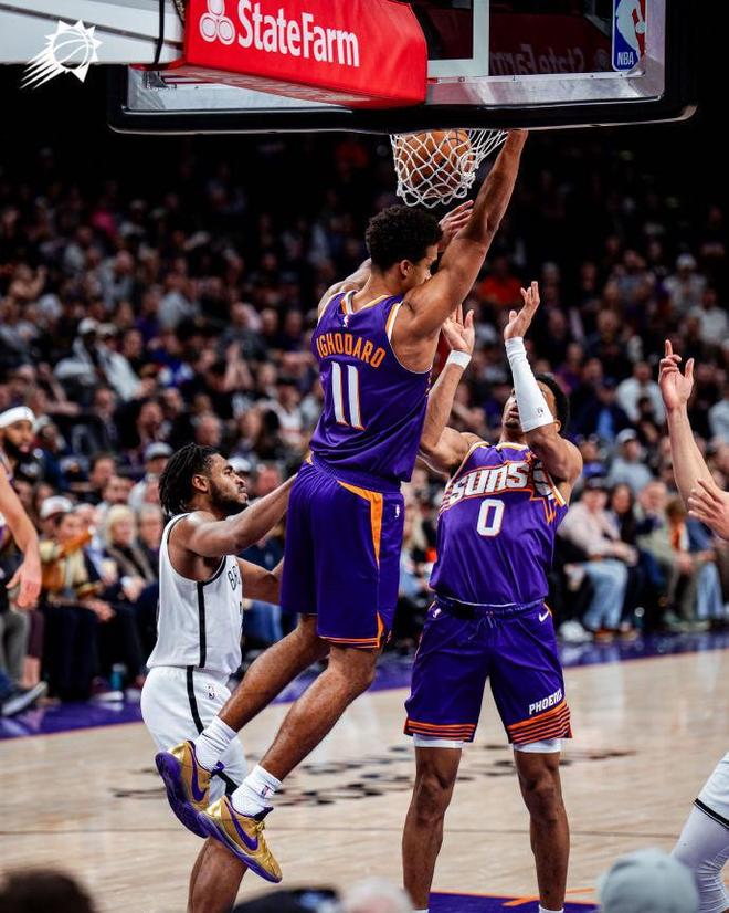 太阳过去两场连输老鹰与热火遭遇2连败,篮网过去5场遭遇5连败,本赛季首次交锋太阳客场126-117战胜篮网。本场太阳缺少布克、杰伦-格林与吉莱斯皮,篮网缺少马丁、海史密斯与克洛尼。首节前半节双方持续交替领先,缠斗至太阳15-14领先,太阳一波8-0攻势扩大9分优势。篮网回敬一波15-5攻势反超比分,狄龙一度被吹罚一级恶意犯规,首节结束太阳28-29落后篮网。首节篮网23中13,其中三分4中1,波特7中6得到12分;太阳24中13,其中三分6中1,马威7中5得到10分与狄龙7分。