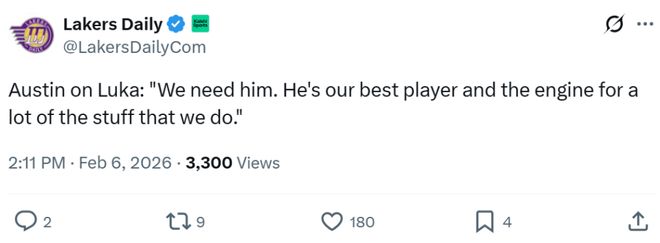赛后湖人主帅雷迪克被问到相关问题,他表示东契奇左腿筋有些酸痛,他与球队医疗团队一致认为东契奇无法重返赛场。
