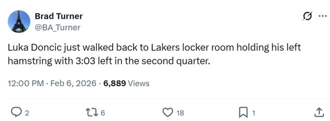 湖人虽然拿下胜利,但核心东契奇因伤退场,在第二节一次进攻回合后,东契奇捂着自己的小腿退场,期间还踢了一下场边的广告牌看起来十分沮丧,队记Brad Turner跟进曝出东契奇是左腿筋受伤。