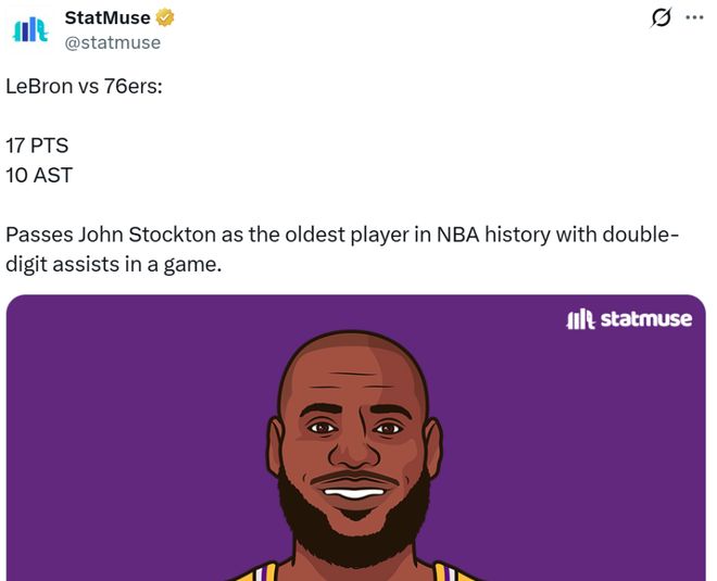 尽管状态低迷,但41岁38天的詹姆斯还是超越斯托克顿(41岁19天),成为NBA历史上单场助攻上双最老球员。