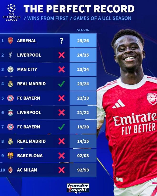 取7连胜的阿森纳以7/2的概率高居的第一,被认为是最大热门,拜仁慕尼黑(9/2)和曼城(7/1)分列第二、三位,构成了争冠的第一梯队。